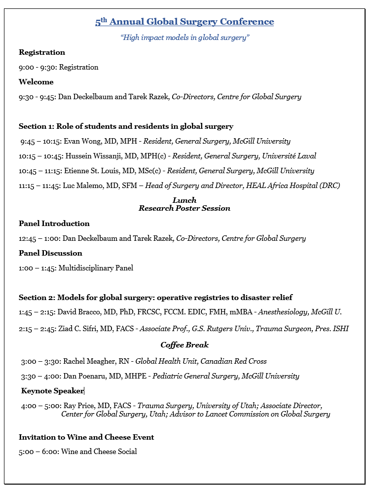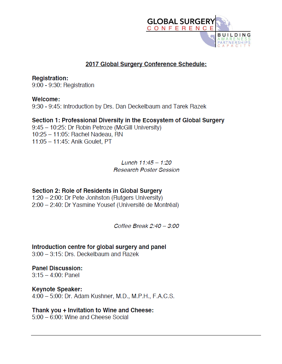 The CGS MUHC Global Surgery Conference is a student-led conference that occurs annually at McGill University to expose students to global surgery leaders and ongoing projects around the world. This year, the conference will be held on April 13 2024 on the theme: Innovation in Global Surgery.